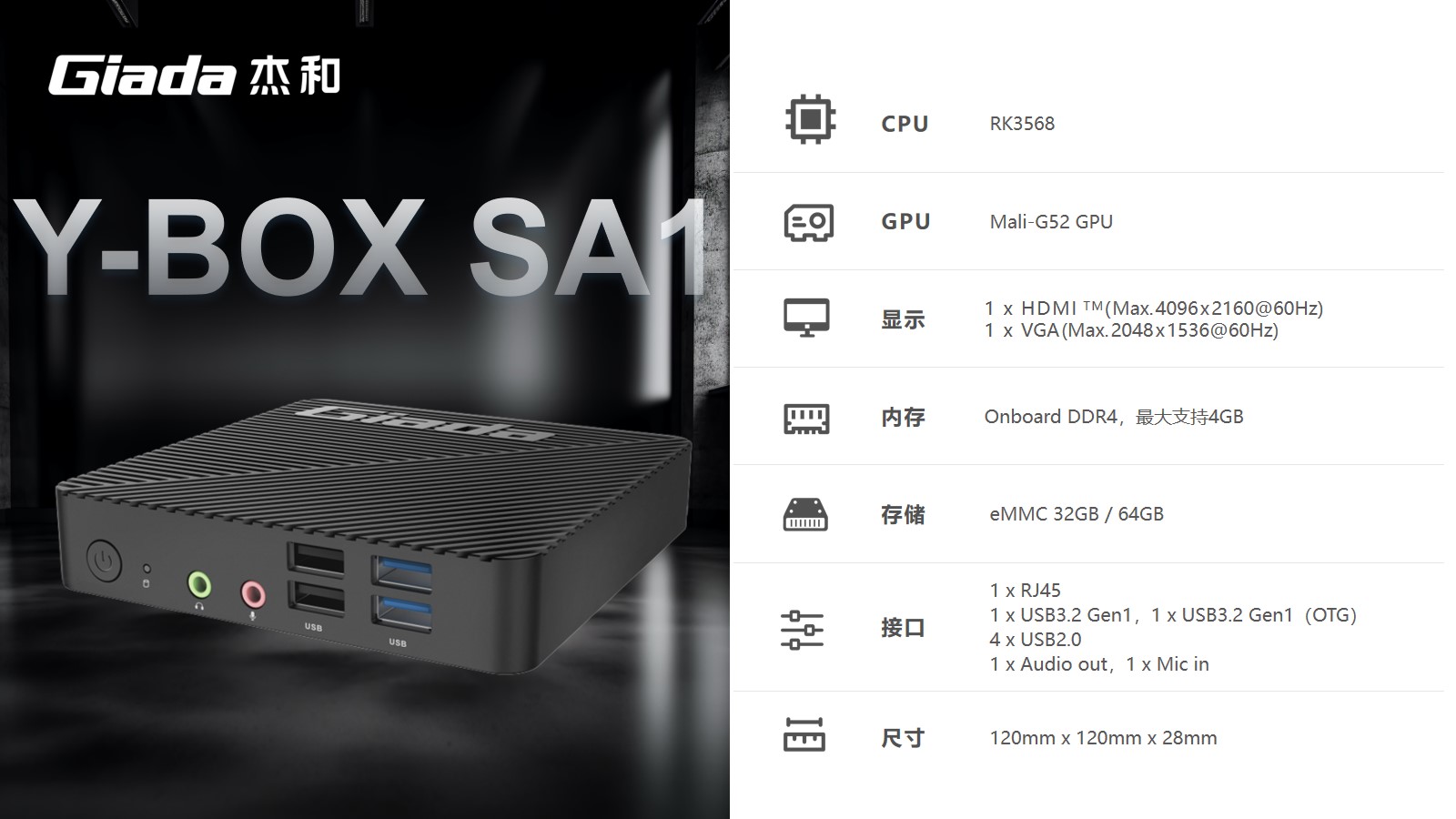 Y-BOX SA1在硬件配置上进行了精心设计,内置了4GB的高速DDR4内存,确保系统运行流畅。同时,提供了两种存储选项,分别是32GB和64GB的eMMC存储,以满足不同用户对存储容量的需求。