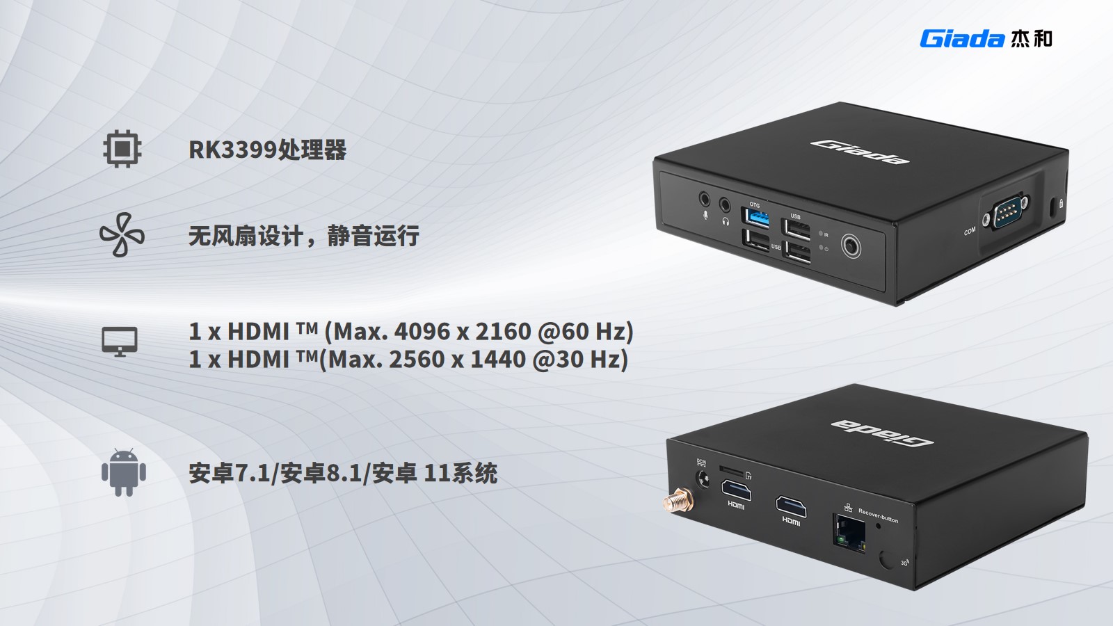 DN74支持安卓7.1、安卓8.1、安卓11系统,采用瑞芯微RK3399处理器,支持板载双通道LPDDR4内存、eMMC5.1存储以及双频WiFi、蓝牙4.2。视频拥有2个HDMI接口,分别能达到4K、2K分辨率显示输出,无风扇设计,适合安静运行。