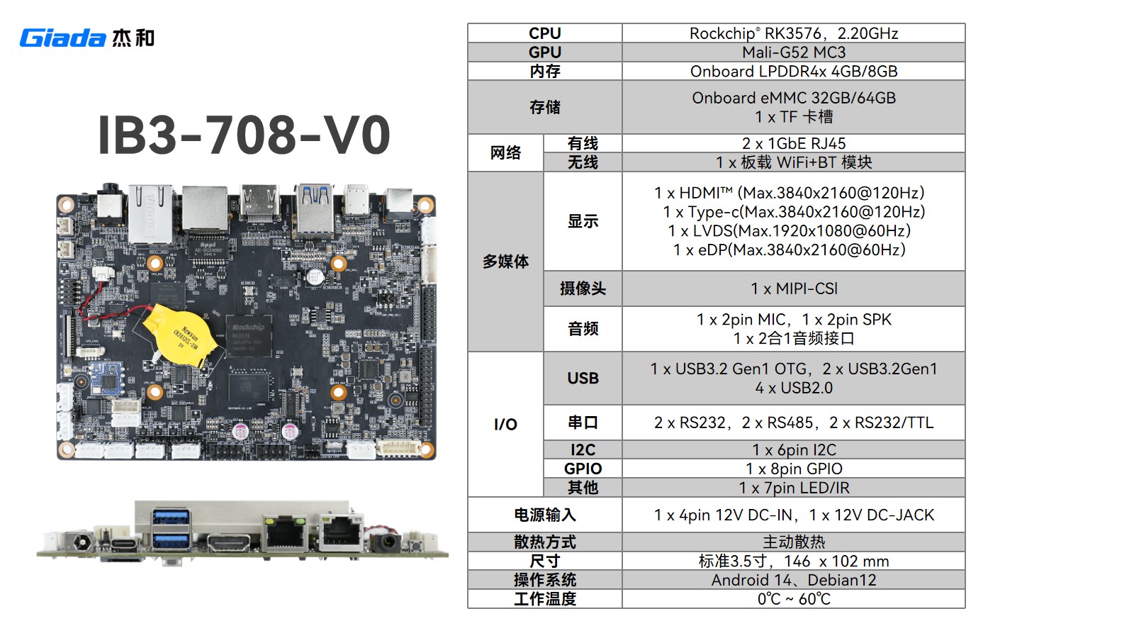 IB3-721同样采用 RK3288 处理器,通过精简接口进一步控制成本:保留 1GbE RJ45 网口,删减 RJ12 ,USB 减至 5 个、TTL 串口减为 3 个 ,在满足基础商显交互(如零售机、查询机)同时,降低成本,适配功能聚焦、对成本敏感场景 。