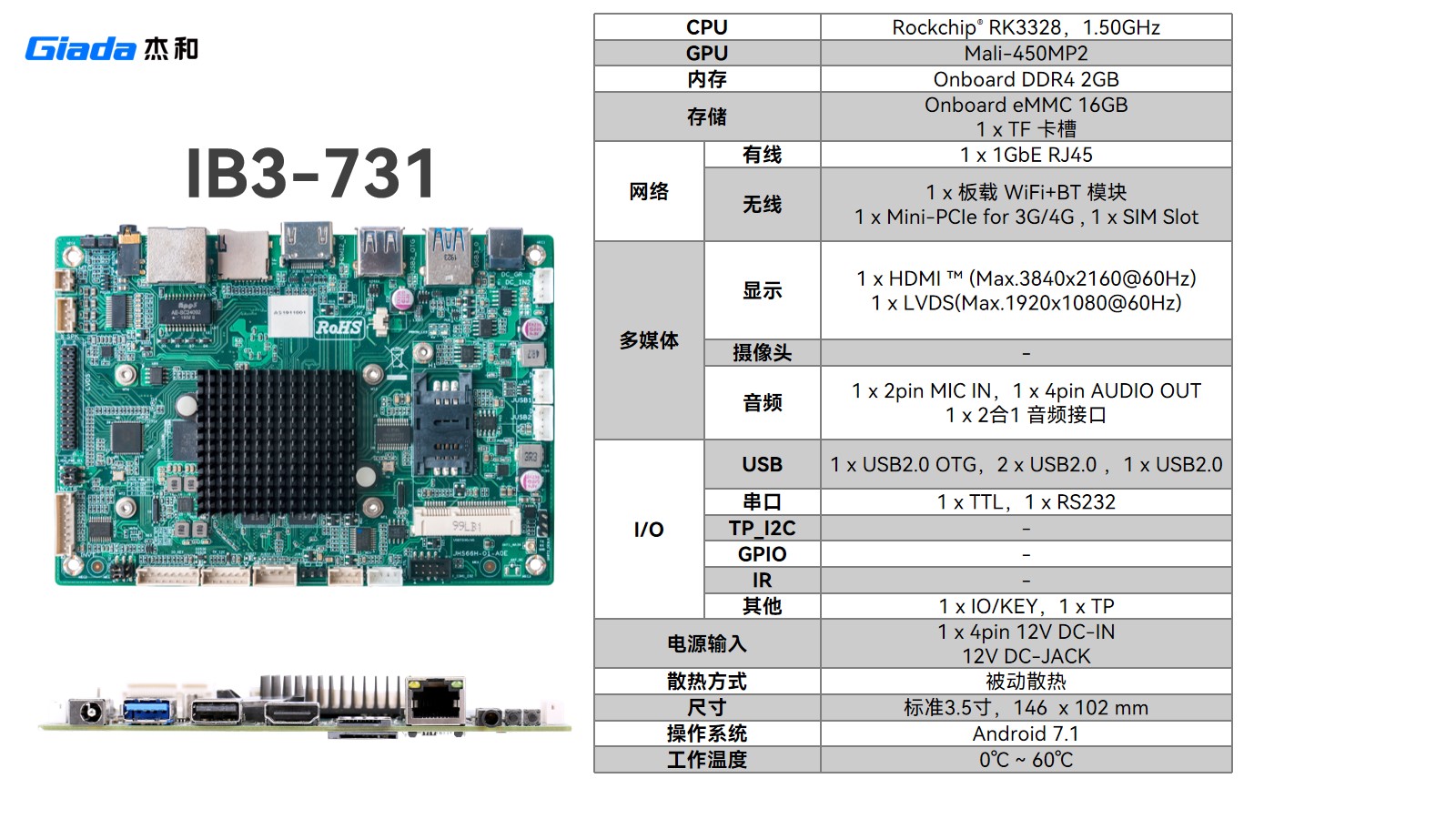 IB3-731搭载RK3328处理器,主频1.50GHz,2GB DDR4内存+ 16GB eMMC 存储。1GbE RJ45、板载 WiFi + BT及Mini - PCIe扩展 3G/4G,适配多网络环境;HDMI(4K@60Hz)+ LVDS(1080P@60Hz)双显输出,在便利店无人零售终端,可自行实现基础视频播放、交互。是预算有限、聚焦基础展示交互项目首选 。