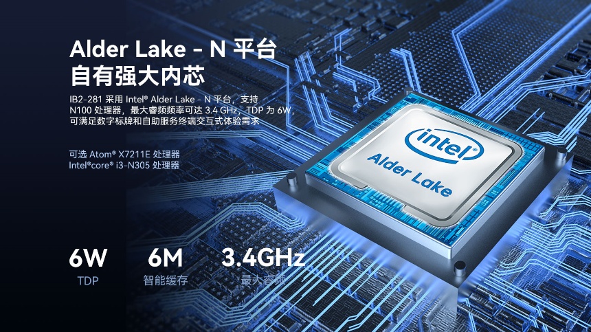 性能与功耗的平衡:IB2-281采用intel®Alder Lake-N平台,支持N100处理器,最大睿频频率可达3.4GHz,如此强悍性能情况下,功耗仅为6W。某连锁品牌全国部署超1万台无人零售设备,每年单电费,可节省近百万元运营成本,这是一笔不容小觑的纯利润。