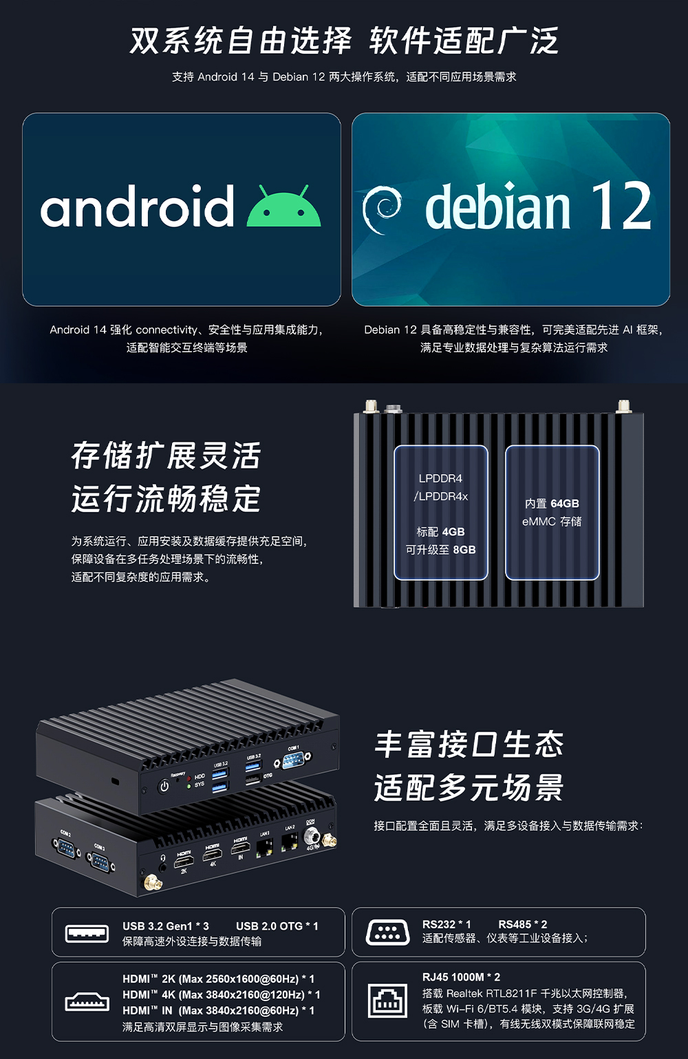 它提供 Android 14 与 Debian 12 双系统选择,兼顾连接安全性、应用兼容性与 AI 框架适配性,搭配最高 8GB LPDDR4/4x 内存与 64GB eMMC 存储,满足不同算力与存储需求。