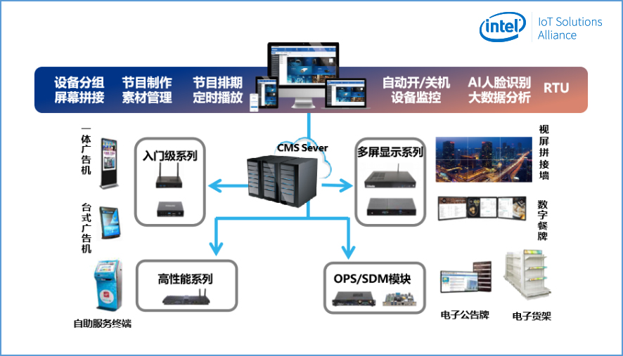 为了更好的迎合行业的发展趋势,向零售业输送前沿的营销理念和模式,驱动零售行业迈向数字化、智慧化的运营模式,米兰体育科技经过多年的行业经验积累和对客户需求的探索,通过集成Intel®Movidius视觉识别技术和OpenVINOTMAI视觉学习技术,自主研发了一套GDSM智慧商显管理系统平台,加上米兰体育科技多年来在商显行业的产品开发经验,已整合成为一套完整的智慧商显整体解决方案。目前GDSM智慧商显解决方案已成熟的应用于商超零售、品牌餐饮等多个行业,并获得了Intel®MRS市场方案认证。
