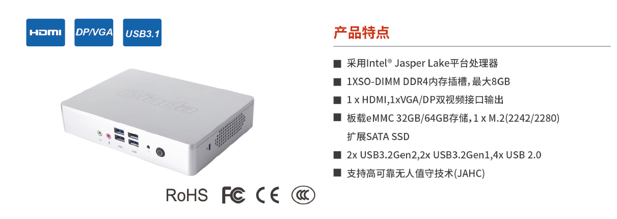VT26采用JasperLake平台,搭载N5095处理器,使用IntelUHD Graphics,提供一组HDMI数字显示接口,支持4K超高清内容显示,一组VGA模拟显示接口,最大1080P单屏播放能力,提供高清流畅的桌面体验,为用户体验带来质的提升。