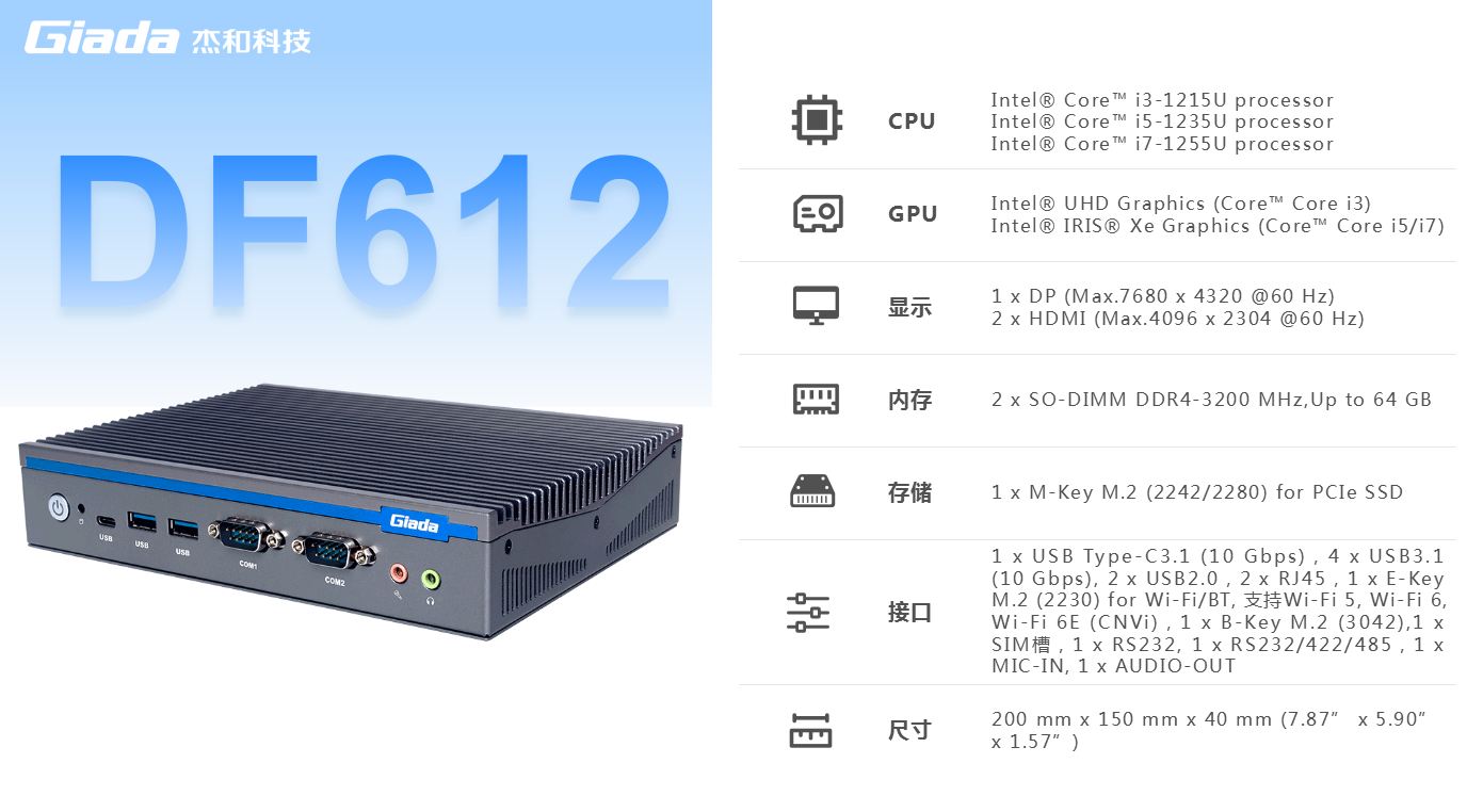 米兰体育科技,商用显示硬件解决方案领导者,深耕商业显示领域24年,业务遍布欧洲,美洲,东南亚和南非等60多个国家,服务超过3000名客户,自有品牌 Giada 已成为欧洲数字标牌媒体播控器的领导品牌。在DF系列产品中,DF612作为一款全新的嵌入式计算机,搭载英特尔第12代Alder Lake处理器,具有突破性的技术、增强的图形处理能力和丰富的I/O接口,广泛应用于商业显示、智能车载、安防领域和边缘人工智能等场景。