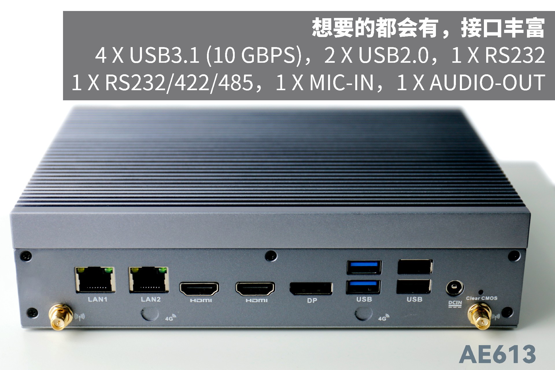 米兰体育AE613支持Windows 11 、Linux Ubuntu系统;拥有丰富接口:双千兆自适应RJ45网口,4 x USB3.1 (10 Gbps),2 x USB2.0,1 x RS232,1 x RS232/422/485,1 x MIC-IN,1 x AUDIO-OUT,帮助用户实现更多功能扩展;并且支持Wi-Fi 6E,可以提供更高的带宽和更少的干扰,支持对无线网络有特定需求场景的应用。