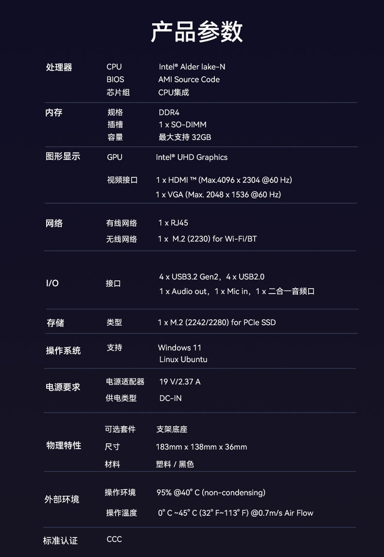 1、支持intel最新平台 Alder Lake-N平台处理器,为英特尔首款基于 7nm 的产品线,最高可支持到8核;